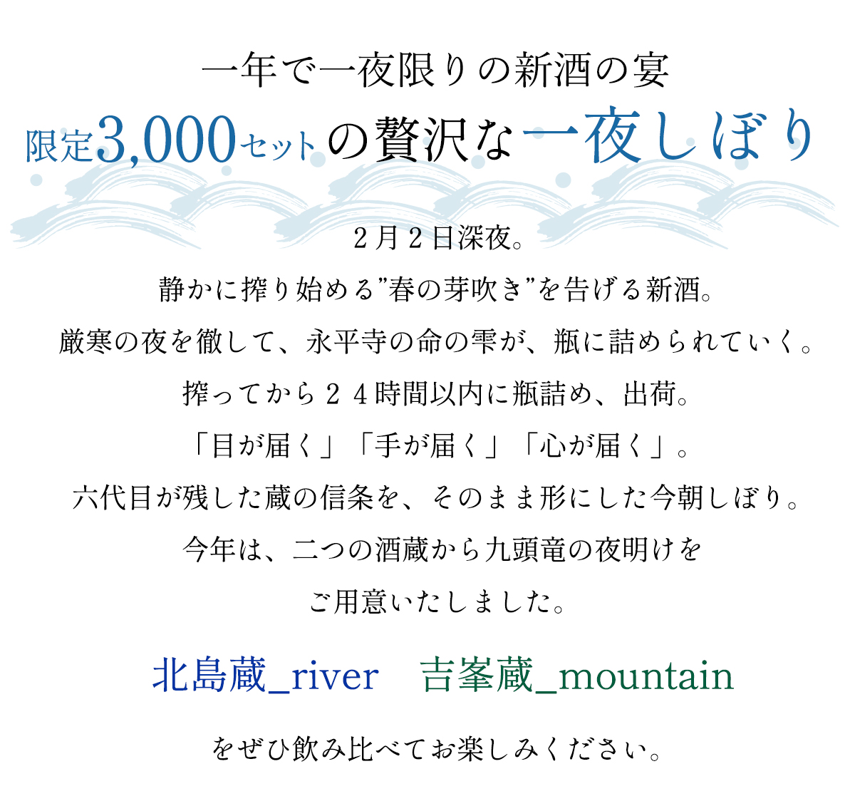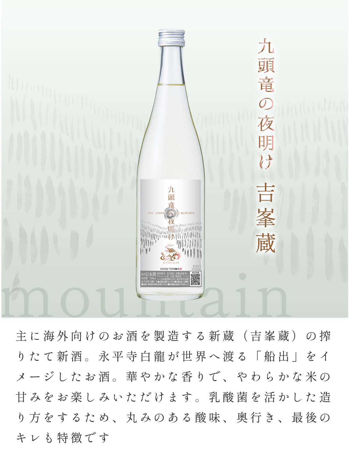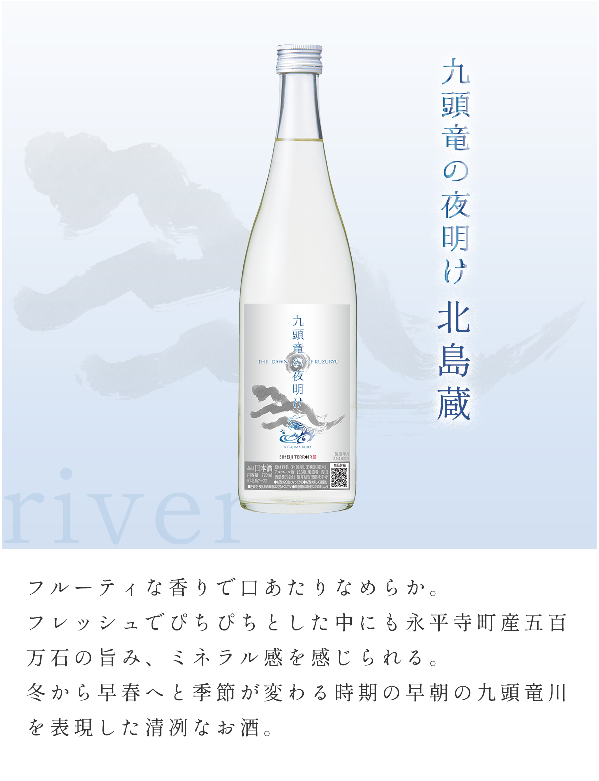 このエピソードとともに、ちょうど立春前をめがけて一足早く瑞々しい春をお届けしたいという心を込めて、商品名を『九頭竜の夜明け』といたしました。